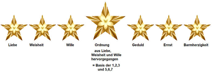 Nehmt Meine sieben Eigenschaften, so findet ihr die Ordnung in der Mitte; denn ohne Ordnung kann ja nichts bestehen, und so ist dieselbe der Grundpfeiler alles Geschaffenen, wenn es erhalten werden soll.